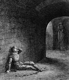 But he still has the senses of an old soldier. And into his awareness comes the sound of movement, out of step with the constant drip drip drip from the vaulted ceiling. The footsteps which approach are unfamiliar, not the clicking and scraping of the gaoler's hobnail boots nor the soft rustling of the Ratsherr's silky shoes, but the soft pad of bare feet. He looks up, and sees a cloaked woman drawing near, carrying a small parcel wrapped in torn rags. His heart is already sinking as she throws back her hood.